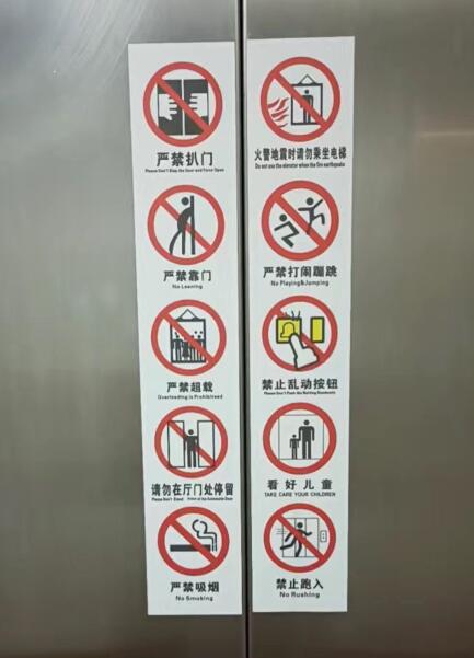 電梯安全標(biāo)識(shí)標(biāo)牌是保障電梯安全運(yùn)行的關(guān)鍵元素,幫助乘客在緊急情況中迅速了解電梯的狀態(tài)和緊急措施。通常,電梯內(nèi)的安全標(biāo)識(shí)牌包括操作說(shuō)明、故障應(yīng)急指南、載重和容納人數(shù)的限制等內(nèi)容,以確保乘客和操作人員在遇到突發(fā)狀況時(shí)能及時(shí)、準(zhǔn)確地進(jìn)行自救或呼救。