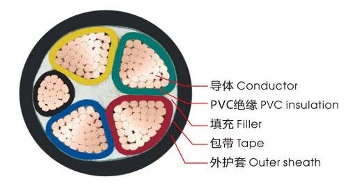 VV電纜結(jié)構(gòu):由內(nèi)而外的組成部分分別為導(dǎo)體、絕緣層、填充層、(鋼帶層)、護(hù)套層?,F(xiàn)如今市面上最常用的導(dǎo)體材料當(dāng)然就是銅導(dǎo)體了;絕緣層和外護(hù)套材料都是聚氯乙烯,即PVC塑料;填充層一般為一些較為柔軟的尼龍材料,為了防止電纜內(nèi)部導(dǎo)體之間的相互直接接觸擠壓;鋼帶鎧裝的VV電纜為VV22電纜,鋼帶鎧裝的作用是抗壓,可用于地埋。