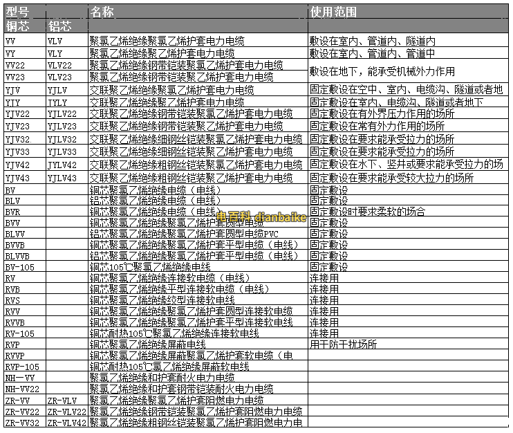 1、絕緣種類:V代表聚氯乙烯;X代表橡膠;Y代表聚乙烯;YJ代表交聯(lián)聚乙烯;Z代表紙。
