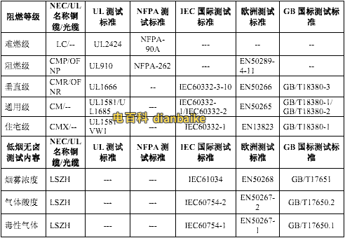 綜上所述,綜合布線線纜的防火等級及對應的測試標準如下表所示: