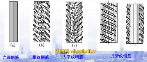 普通鋼筋根據(jù)外徑分為:光面圓鋼筋、麻面的月牙紋鋼筋、螺紋鋼筋、人字紋鋼筋。如下圖所示: