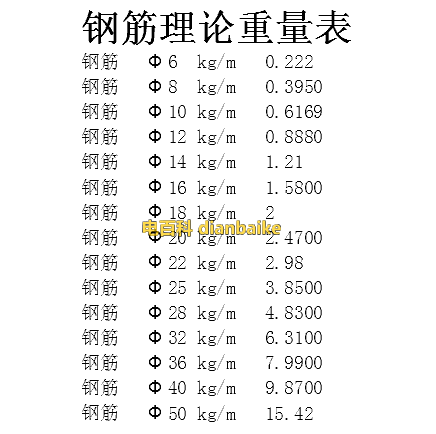 鋼筋理論重量表及計算公式:G/m=0.617*D*D/100。表達的含義就是:鋼筋每米的重量(Kg)=鋼筋的直徑(mm)×鋼筋的直徑(mm)×0.00617。更多關(guān)于鋼筋問題請關(guān)注電百科,盜載必究。