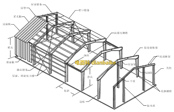 根據(jù)力學(xué)原理 門式剛架結(jié)構(gòu)以柱、梁組成的橫向剛架為主受力結(jié)構(gòu),剛架為平面受力體系;為保證縱向穩(wěn)定,設(shè)置柱間支撐和屋面支撐;剛架,剛架柱和梁均采用截面H型鋼制作,各種荷載通過(guò)柱和梁傳給基礎(chǔ);支撐、系桿,剛性支撐采用熱軋型鋼制作,一般為角鋼;柔性支撐為圓鋼,系桿為受壓圓鋼管,與支撐組成受力封閉體系。更多關(guān)于鋼結(jié)構(gòu)問(wèn)題請(qǐng)關(guān)注電百科,盜載必究。