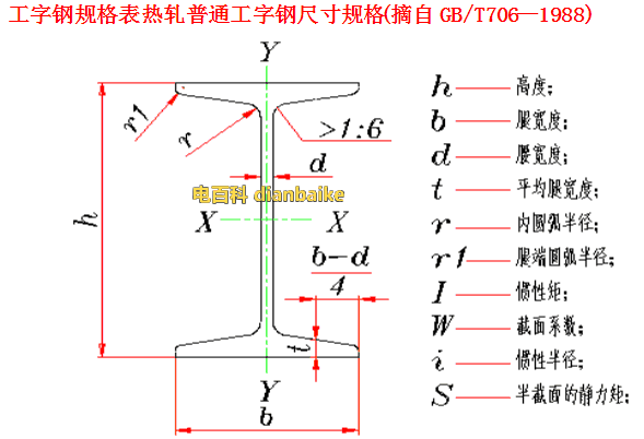 工字鋼規(guī)格以:腰高( h)*腿寬(b)*腰厚(d)的毫數(shù)表示,如“工160*88*6”,表示含義是腰高為160毫米,腿寬為88毫米,腰厚為6毫米的工字鋼。