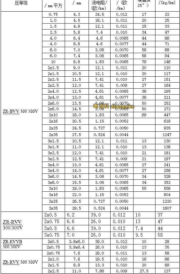1、銅線BV、RV系列阻燃電線電纜的載流量表